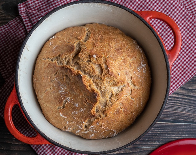 Πάσχα στο χωριό μπορεί να μην κάνουμε φέτος, αλλά το σπιτικό ψωμί δε θα λείψει από κανέναν. Αυτή η συνταγή που δε θέλει ούτε τεχνική ούτε ζύμωμα ούτε μίξερ, πετυχαίνει ακόμη και σε εκείνους που πιάνουν πρώτη φορά ζυμάρι στα χέρια τους. Καθόλου κόπος, μόνο χρόνος αναμονής χρειάζεται, γι’ αυτό φτιάξτε τη ζύμη το βράδυ τις προηγούμενης μέρας, ώστε να τη βρείτε το πρωί έτοιμη. Με ποιοτικό Αλεύρι Robin Hood, μαγιά στιγμής, αλάτι και νερό, θα έχετε πεντανόστιμο ψωμί, αφράτο μέσα, τραγανό έξω. Αν δεν έχετε μαντεμένια γάστρα με καπάκι, ανατρέξτε στο tip εναλλακτικού ψησίματος στο τέλος του κειμένου.