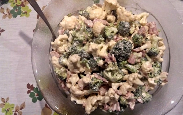 Ρίχνετε σε μπολ ή στη σαλατιέρα το μπρόκολο, το κουνουπίδι και το μπέικον. Προσθέτετε τη σάλτσα της μαγιονέζας και ανακατεύετε. Αφήνετε τη σαλάτα για 2 ώρες ψυγείο και μετά είναι έτοιμη για σερβίρισμα!
