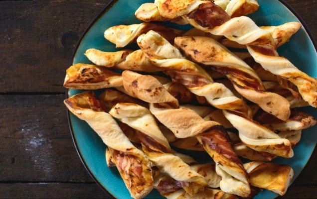 Αλείφετε τη σφολιάτα με λίγη μουστάρδα. Την κόβετε σε 12 στενές λωρίδες. Παίρνετε 1 λωρίδα σφολιάτας με 1 λωρίδα μπέικον και τις στριφογυρίζετε μαζί σε κορδόνι.