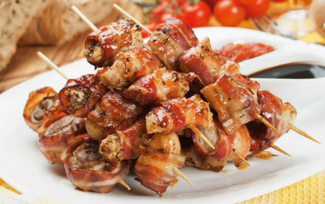 Σουβλάκια κοτόπουλου και μανιταριών με μπέικον