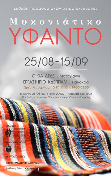Η φήμη του χειροποίητου υφαντού της Μυκόνου, που σήμερα τελεί υπό εξαφάνιση, κάποτε πήρε παγκόσμιες διαστάσεις. Μέσα από υφάσματα και ρούχα, εργαλεία υφαντικής, φωτογραφικό υλικό και σχετικά δημοσιεύματα στον Τύπο της εποχής, η έκθεση επιχειρεί να παρουσιάσει την εξέλιξή του και θέτει κύριο στόχο της να μας φέρει ξανά σε επαφή με την τέχνη του αργαλειού. Με την ίδια πρόθεση η Αννεζώ Κουσαθανά Μιχελή (Μπέμπη) στήνει τον αργαλειό της μητέρας της Βγενούλας, με τη βοήθεια της Κατίνας Κουσαθανά Κουκά (του Λύκου) ανυφάντρας μέχρι σήμερα.