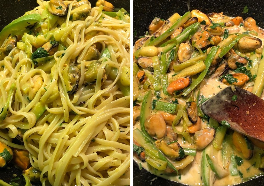 Πρόκειται για ένα πιάτο ζυμαρικών με μύδια και λαχανικά, για το οποίο η Μυρτώ Αλικάκη δηλώνει πως είναι πεντανόστιμο παραθέτοντας τη συνταγή του. Γράφει λοιπόν στη λεζάντα των εικόνων: «Ένα πιάτο αφιερωμένο στον @dimitrisskarmoutsos ???????????????? Μακαρονάδα με μύδια, σαφράν, λαχανικά, και κρέμα γάλακτος!!!! Σε ένα βαθύ τηγάνι βάζετε ένα κομμάτι βούτυρο, περίπου δύο κουταλιές της σούπας, και μία σκελίδα σκόρδο ολόκληρη. Ρίχνετε μέσα τα μύδια, με λίγο σαφράν και πιπέρι και τα αφήνετε για 5 λεπτά. Σβήνετε με μισό ποτήρι κρασί. Μετά από περίπου 5 λεπτά τα αδειάζετε σε ένα Μπολ. Στο ίδιο τηγάνι ρίχνετε λίγο ελαιόλαδο, και τσιγαρίζετε κολοκύθι κομμένο σε μπαστουνάκια και πράσο. Προσθέτετε σαφράν , αλάτι , πιπέρι, και λίγο σκόνη knorr λαχανικών . Όταν τα λαχανικά έχουν ροδίσει, ρίχνετε ψιλοκομμένο μαϊντανό,και μετά μια κρεμα γάλακτος και κατεβάζετε από τη φωτιά ! Μέσα στο τηγανι ρίχνετε τα βρασμένα μακαρόνια , ανακατεύετε και σερβίρετε αμέσως ! Είναι πεντανόστιμο!»