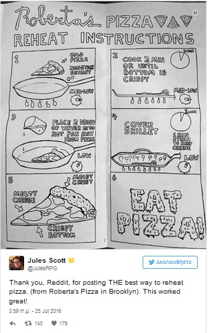 Όπως αναφέρει το Today, ένας χρήστης του Reddit, μας έσωσε, ανεβάζοντας ένα σκίτσο στο οποίο προτείνει τον πιο σωστό τρόπο με τον οποίο μπορούμε να ξαναζεστάνουμε την πίτσα μας.
