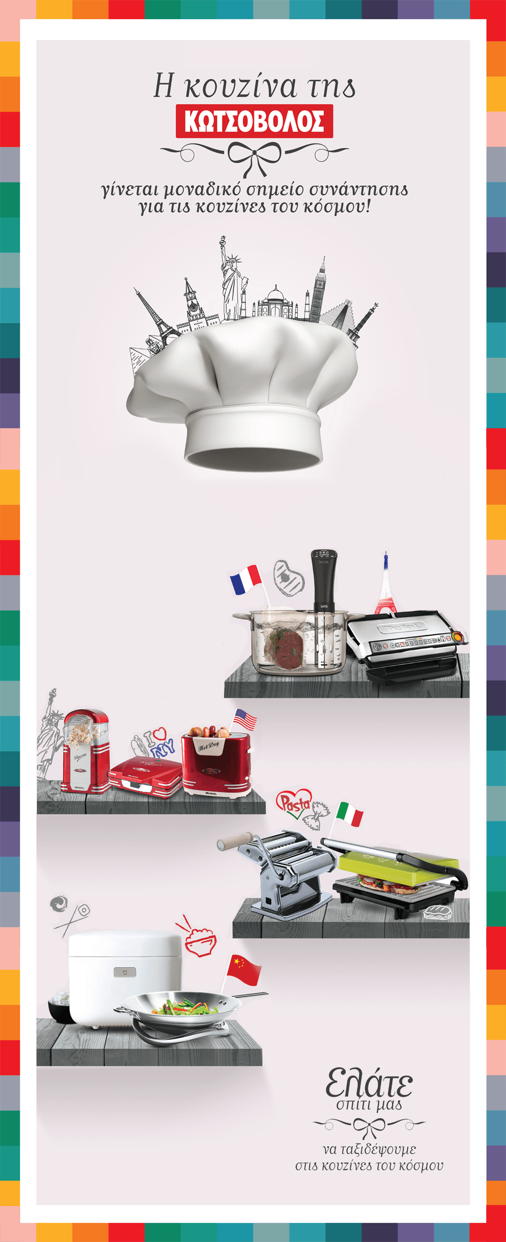 Η Ιταλία, η Γαλλία, οι Ηνωμένες Πολιτείες Αμερικής, αλλά και η Άπω Ανατολή βρίσκουν τη θέση τους σε επιλεγμένα καταστήματα Κωτσόβολος και το ταξίδι ξεκινά. Το Croque Monsier συναντά το σούσι και τα σπιτικά ζυμαρικά συναγωνίζονται με το αγαπημένο σε όλους hot dog, με τα απαραίτητα μαγειρικά «εργαλεία» να εκτελούν εκτός από τις συνταγές και «χρέη διερμηνέα»! Ηλεκτρικές συσκευές που χαρακτηρίζονται για το μοντέρνο σχεδιασμό τους, τις φινετσάτες γραμμές τους, αλλά κυρίως τις εξειδικευμένες λειτουργίες τους, θα αποτελέσουν όχι μόνο μια μοναδική προσθήκη στον πάγκο της κάθε κουζίνας, αλλά και το απαραίτητο όχημα σε αυτή την «περιπέτεια» γεύσεων.