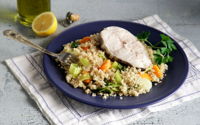 Μπακαλιάρος με πράσα, καρότα και κινόα