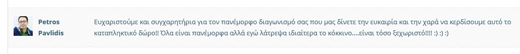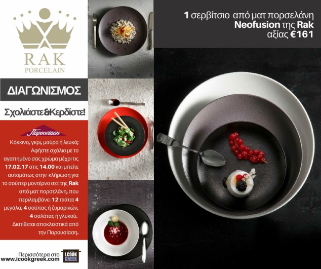 Τον κ. Πέτρο Παυλίδη (Petros Pavlidis) ανέδειξε η κλήρωση της 17.02.16 ως το μεγάλο τυχερό, που κερδίζει ένα φινετσάτο σετ 12 τεμαχίων από ματ πορσελάνη της ολοκαίνουριας σειράς Neofusion της Rak στο χρώμα που διάλεξε (κόκκινο)! Tο σερβίτσιο διατίθεται κατ’ αποκλειστικότητα από τα καταστήματα Παρουσίαση. Ευχαριστούμε όλους τους φίλους και τις φίλες του I Cook Greek – Συνταγές Μαγειρικής / Greek Recipes που έλαβαν μέρος και ευχόμαστε να είναι νικητές στον επόμενο Διαγωνισμό μας.