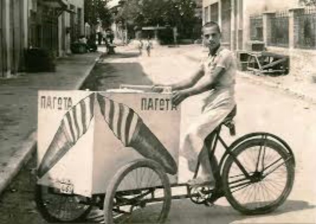 Όμως τους παγωτατζήδες είναι σαν να τους έζησα. Θες οι ελληνικές ταινίες εποχής, θες οι διηγήσεις του πατέρα μου, που ανέδιδαν την αίσθηση πως δεν είχε γλυκύτερη καλοκαιρινή ανάμνηση ως παιδί, απ’ το να σκάσει ο παγωτατζής με το καρότσι που συνήθως έσπρωχνε μες στη ζέστη σε κάποιο χωματόδρομο, οι παγωτατζήδες με συγκινούν σαν κάτι νοσταλγικά οικείο –χωρίς κάποιο ιδιαίτερο στοιχείο προσωπικού βιώματος. Έτσι σήμερα που έψαχνα στο διαδίκτυο για ένα θέμα παντελώς άσχετο (ωε συνήθως) κι έπεσα τυχαία στην εικόνα με τα ΠΑΓΩΤΑ ΤΑΫΓΕΤΟΣ στο υπαίθριο παζάρι και είδα κι εκείνη την πετρούλα που έχει βάλει στο λάστιχο να μην του φύγει το καρότσι, ο άγνωστος πλανόδιος της χαράς μου ξύπνησε θύμησες από καλοκαίρια που δεν έζησα, αλλά φαίνεται πως αποτελούν τόπους συνάντησης της συλλογικής μας μνήμης.