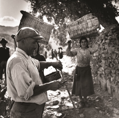 Πορτογαλία, 1951. Όχι, δεν είναι σκηνή από την «Κυρά μας, τη μαμή». Ο Ορέστης Μακρής, εμ…συγγνώμη, ο κύριος με την τραγιάσκα αριστερά χαράσσει το κλαρί που κρατάει στα χέρια του, ώστε να ξέρει πόσα κοφίνια πέρασαν για την αποθήκη.