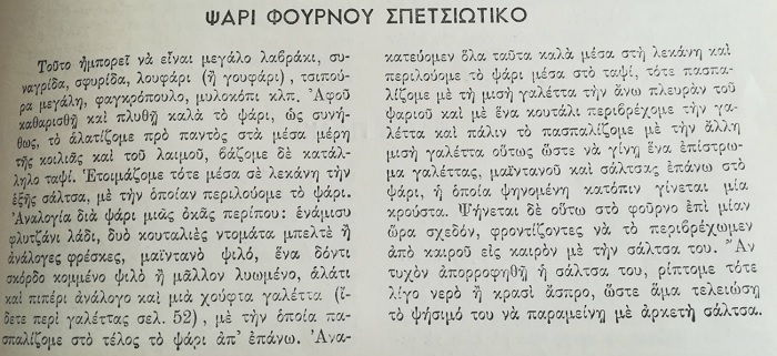 Για ψάρι «αλά σπετσιώτα» ο Νικόλαος Τσελεμεντές προτείνει μεγάλα ψάρια όπως σφυρίδα και συναγρίδα ή λαβράκι. Αυτό που παρατηρεί κανείς διαβάζοντας τη συνταγή του είναι η χρήση της γαλέτας που πλέον τείνει να εξαφανιστεί. Με γαλέτα ή τριμμένη φρυγανιά πασπαλιζόταν το ψάρι και από τις δυο πλευρές του για να δημιουργήσει μια ελαφριά γευστική κρούστα.