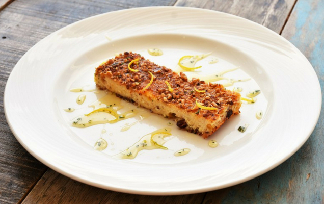 Εκτέλεση Σε μίξερ χτυπάμε τους κρόκους με την ζάχαρη μέχρι το μείγμα να αφρατέψει. Προσθέτουμε την μυζήθρα μέχρι να λιώσει και το βούτυρο. Ανακατεύουμε και ρίχνουμε τις σταφίδες, ξύσμα και χυμό λεμονιού, αλάτι, κανέλα, κόρν φλάουερ και την μισή ποσότητα από τα αμύγδαλα. Χτυπάμε τα ασπράδια σε μαρέγκα και την ενσωματώνουμε στο μείγμα ανακατεύοντας απαλά. Ρίχνουμε λίγα αμύγδαλα στο ταψί και προσθέτουμε το μείγμα. Καλύπτουμε την επιφάνεια με τα υπόλοιπα αμύγδαλα. Ψήνουμε σε προθερμασμένο φούρνο στους 180 βαθμούς για 50 λεπτά. Για το γαρνίρισμα ανακατεύουμε όλα τα υλικά μαζί και συνοδεύουμε το πιάτο.