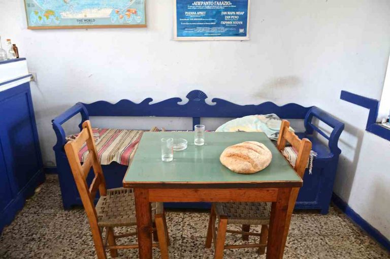 Καφενείο του Νικήτα στην Κολοφάνα. Το καφενείο του Νικήτα, εσωτερικά είναι ευρύχωρο, έχει ένα όμορφο μωσαϊκό για πάτωμα και αρκετά τραπέζια. Το βλέμμα σου κλέβει ένας παλιός μπλε νησιώτικος καναπές –χαρακτηριστικός τύπος αμοργιανού καναπέ, με τους κυματισμούς στην πλάτη, τα κομψά μπράτσα και τον αποθηκευτικό χώρο κάτω από το κάθισμα, και από πάνω η αφίσσα της ταινίας που έκανε διάσημη την Αμοργό: Το Απέραντο Γαλάζιο.
