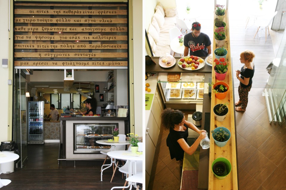 Στη βιτρίνα του καταστήματος, η ποικιλία δε σε βοηθάει να πάρεις άμεσα μία απόφαση. Το φύλλο σε στρώσεις φαίνεται τραγανό και η γέμιση σε κάθε πίτα λαχταριστή. Ο χώρος φιλόξενος και φωτεινός δημιουργήθηκε με αγάπη, πέρα από τα βιομηχανικά πρότυπα διακόσμησης που ακολουθούνται τελευταία στους χώρους εστίασης, και με ιδιαίτερη έμφαση στο φυσικό.