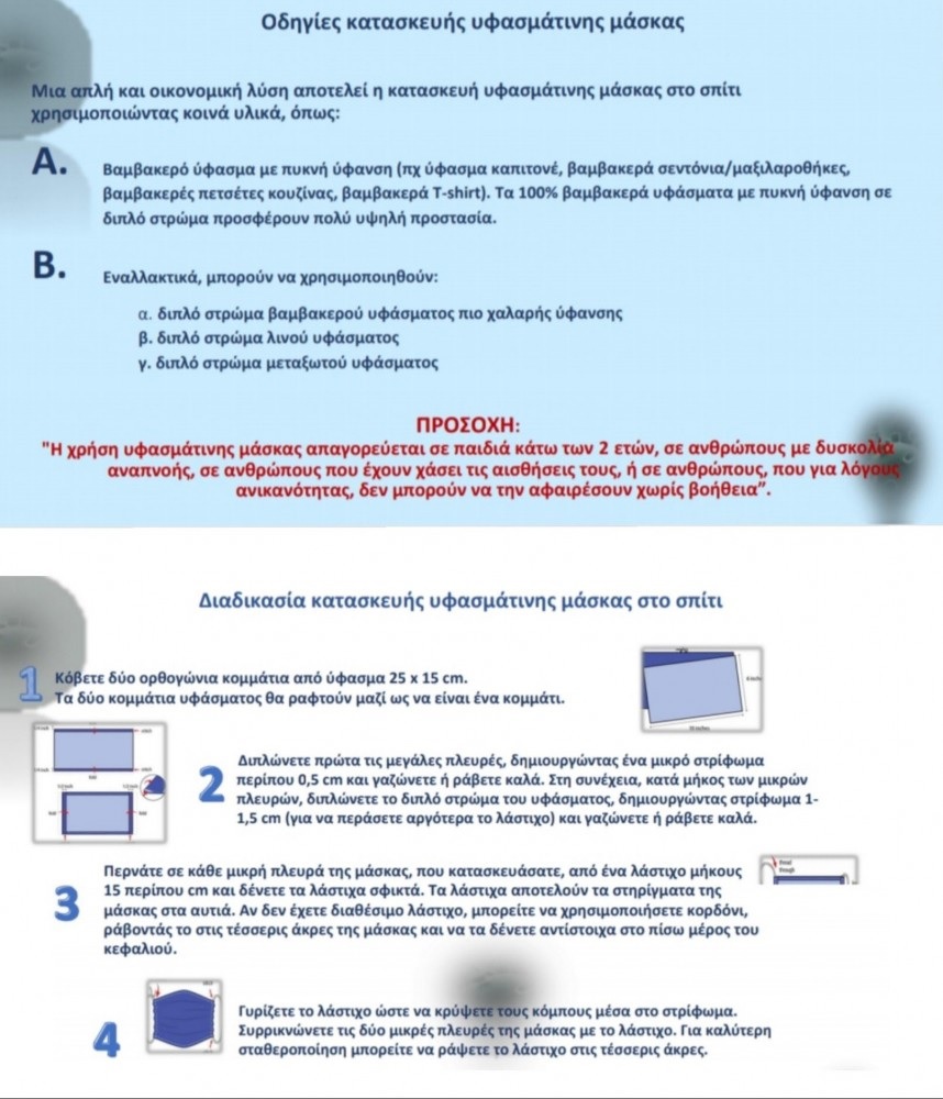 «Η ελληνική βιοτεχνία μπορεί να παράξει άμεσα μεγάλες ποσότητες και υφασμάτινων μασκών. Έγινε με τα αντισηπτικά και τώρα με τις υφασμάτινες μάσκες. Τις φτιάχνουμε όμως εύκολα και οικονομικά και στο σπίτι μας. Τις φοράμε και μένουμε ασφαλείς».