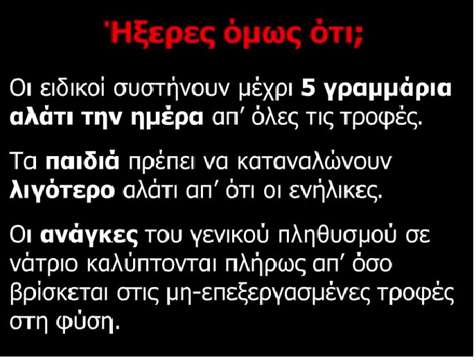 Με σποτ (συν τοις άλλοις) που θα προβάλλεται στις οθόνες των σταθμών του μετρό και του ηλεκτρικού σιδηρόδρομου μέχρι τις 10 Απριλίου του 2014 θα προσπαθήσει ο Ενιαίος Φορέας Ελέγχου Τροφίμων (ΕΦΕΤ) να ευαισθητοποιήσει την κοινή γνώμη για τις σοβαρές συνέπειες που έχει στην υγεία μας η υπερκατανάλωση αλατιού και να μας κάνει να μειώσουμε στα ασφαλή όρια λήψης την καθημερινή κατανάλωσή του.