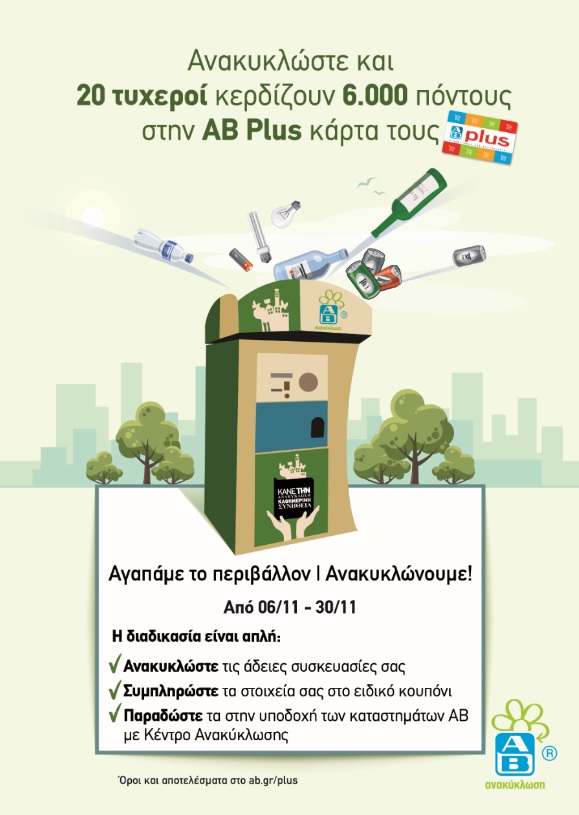 Ο μεγάλος Διαγωνισμός Ανακύκλωσης της AB επιβραβεύει με 6.000 πόντους 20 τυχερούς από 6 – 30 Νοεμβρίου.