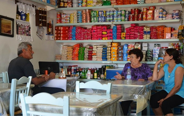 «Το καφενείο είναι όπως παλιά, απλώς τότε στην είσοδο είχαμε και ένα χώρο που πουλάγαμε υφάσματα ρούχα και μερικά είδη νεωτερισμών. Τότε δεν κυκλοφορούσε και πολύ χρήμα. Ερχόντουσαν οι ντόπιοι φέρναν αυγουλάκια ή τα τυροκομικά τους και παίρναν τα προϊόντα του μπακάλικου, καφέδες, απορρυπαντικά κ.λπ. Άλλοι πάλι φέρναν κανά τυράκι ή ζαρζαβατικό μπας και πουληθεί σε περαστικούς. Τότε τα περισσότερα τρόφιμα ήταν δικά μας, ο καθένας είχε το μποστάνι του».