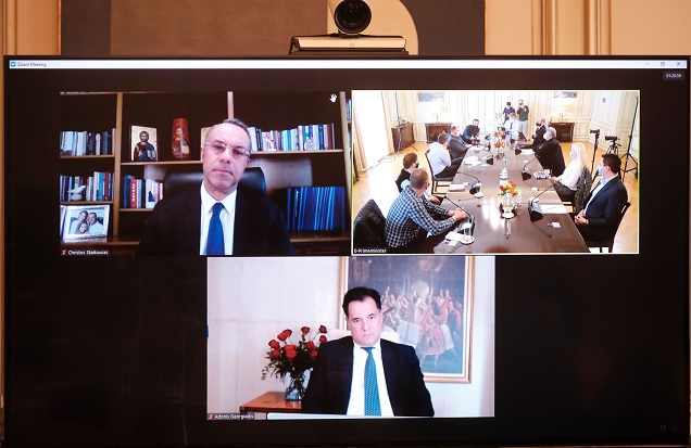 Επιπλέον μέσω τηλεδιάσκεψης στη συζήτηση συμμετείχαν ο υπουργός Οικονομικών, Χρήστος Σταϊκούρας, και ο υπουργός Ανάπτυξης και Επενδύσεων, Άδωνις Γεωργιάδης, ενώ παρών στη συνάντηση ήταν, επίσης, ο υφυπουργός παρα τω πρωθυπουργώ, αρμόδιος για τον συντονισμό του κυβερνητικού έργου, Άκης Σκέρτσος.