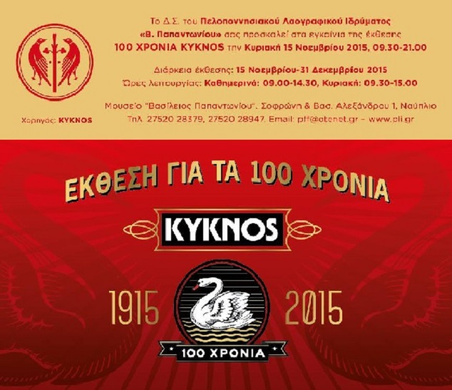 Με αφορμή τα 100 χρόνια ύπαρξής της, η Ελληνική Εταιρία Κονσερβών ΚYKNOS, που σύνδεσε το όνομά της με τον πελτέ και την ντομάτα κονσέρβας, μας καλεί στο Ναύπλιο, την Κυριακή 15 Νοεμβρίου 2015 στις 18.30, στο Πελοποννησιακό Λαογραφικό Ίδρυμα “Β. Παπαντωνίου” στα εγκαίνια της έκθεσης «100 χρόνια KYKNOS». Η έκθεση θα συνεχιστεί μέχρι το τέλος του έτους.