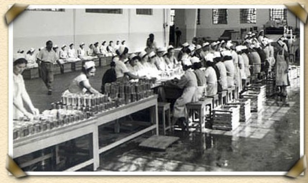 1930. Εργάτριες τοποθετούν τα ολόκληρα αποφλοιωμένα τοματάκια στα λευκοσίδηρα κουτιά που θα ταξιδέψουν σε Ευρώπη και Αμερική (1930).
