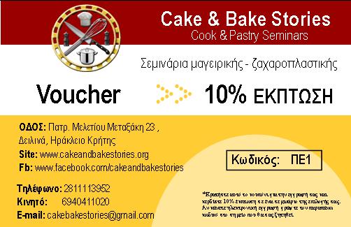 Για την έκπτωση των φίλων του icookgreek.com: Πληκτρολογήστε τον κωδικό που βλέπετε στο κουπόνι της εικόνας (κάτω) στη φόρμα Eγγραφής/πεδίο Voucher και η έκπτωση γίνεται αυτόματα. Η έκπτωση ισχύει για οποιοδήποτε σεμινάριο μαγειρικής ή ζαχαροπλαστικής επιλέξετε από το www.cakeandbakestories.org
