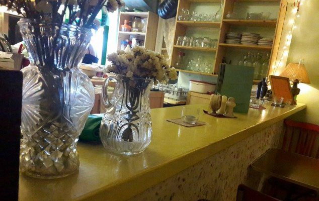 Με τα λιγοστά τραπεζάκια έξω σε καλεί να περάσεις το κατώφλι του, να μπεις στο εσωτερικό του και να ενθουσιαστείς από την ξεχωριστή αισθητική του. Μωσαϊκό πάτωμα, παλιά έπιπλα και αντικείμενα προσεκτικά διαλεγμένα, μοντέρνες πινελιές και σερβίτσια μπερδεμένα σαν αυτά που βρίσκουμε στα ντουλάπια της γιαγιάς. Ένας χώρος από άλλη εποχή που εναρμονίζεται απόλυτα με το σήμερα, ικανός να σε χαλαρώσει έτσι ώστε να απολαύσεις το φαγητό και την καλή παρέα.