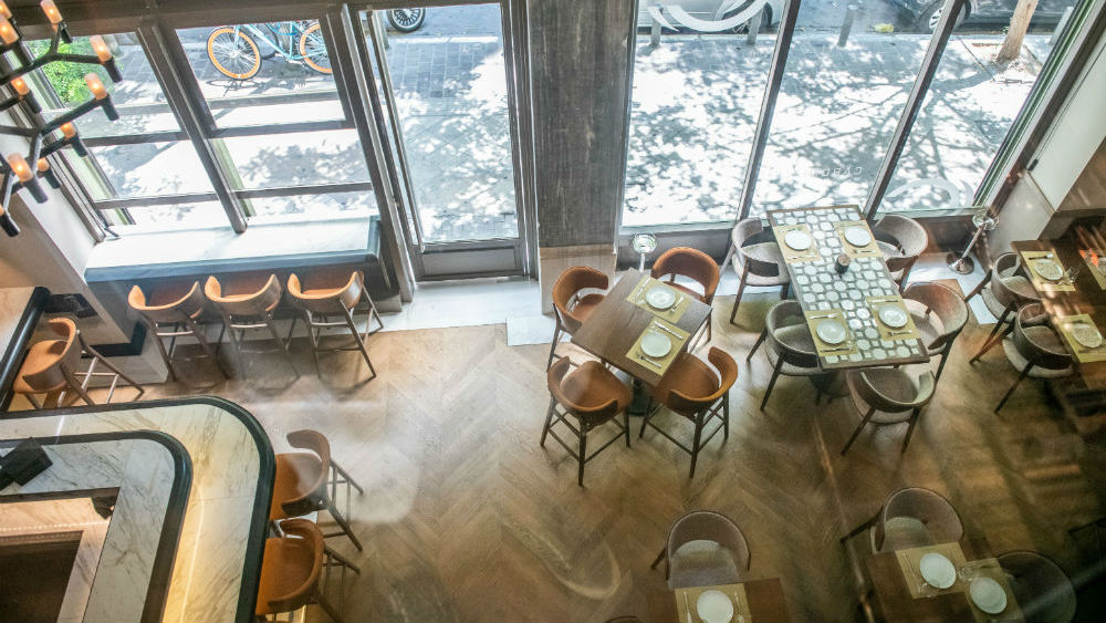 Οι πολλές γωνιές σε καλούν να επιλέξεις ανάλογα με τη διάθεσή σου και να καθίσεις στα τραπέζια με τις αναπαυτικές σκουρόχρωμες καρέκλες, να μοιραστείς το ψηλό κεντρικό μαρμάρινο τραπέζι με την παρέα σου ή να τσιμπολογήσεις στο mozzarella bar και στα άνετα πάσα χαζεύοντας το πηγαινέλα του δρόμου. Το χώρο εποπτεύει η εντυπωσιακή γυάλινη κάβα, έτσι φωτισμένη ώστε τα χρώματα από τις φιάλες να αντανακλώνται στη σάλα. «Έχουμε πολλή Ιταλία στη wine list, αλλά δεν γίνεται να μην έχω και μια Σαντορίνη για τους ξένους επισκέπτες», μου λέει η Φωτεινή για το καμάρι της.