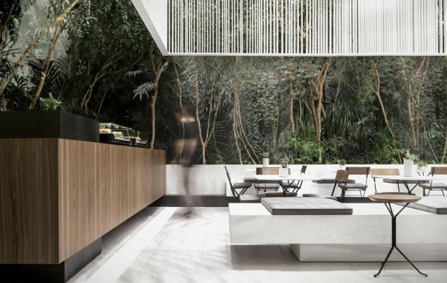 Ο σύγχρονος σχεδιασμός του νέου Cycladic Café έγινε από το βραβευμένο αρχιτεκτονικό γραφείο Kois Associated Architects με πηγή έμπνευσης τη συλλογή της Κυκλαδικής Τέχνης του Μουσείου. Κατά την είσοδο στο café, φως και βλάστηση ξαφνιάζουν απρόσμενα το βλέμμα δίνοντας την αίσθηση ενός κήπου μέσα στην πόλη. Το υποβλητικό αέρινο στέγαστρο-γλυπτό του Στέλιου Κόη, σήμα κατατεθέν του νέου Cycladic Café, δημιουργεί διακριτικές φωτοσκιάσεις, ενώ το φυσικό φως που διαχέεται στο χώρο συμπληρώνει φωτισμός με την υπογραφή της Ελευθερίας Ντεκώ. Κύρια χαρακτηριστικά του χώρου είναι η λιτότητα, η αφαίρεση, το μέτρο και η αρμονία. Παράλληλοι μαρμάρινοι πάγκοι συνδυάζονται με φυτά που φτάνουν μέχρι την οροφή του Αιθρίου -υπό τη μελέτη και επίβλεψη της doxiadis+ Αγγελική Μαθιουδάκη, Αρχιτέκτων, Αρχιτέκτων Τοπίου.