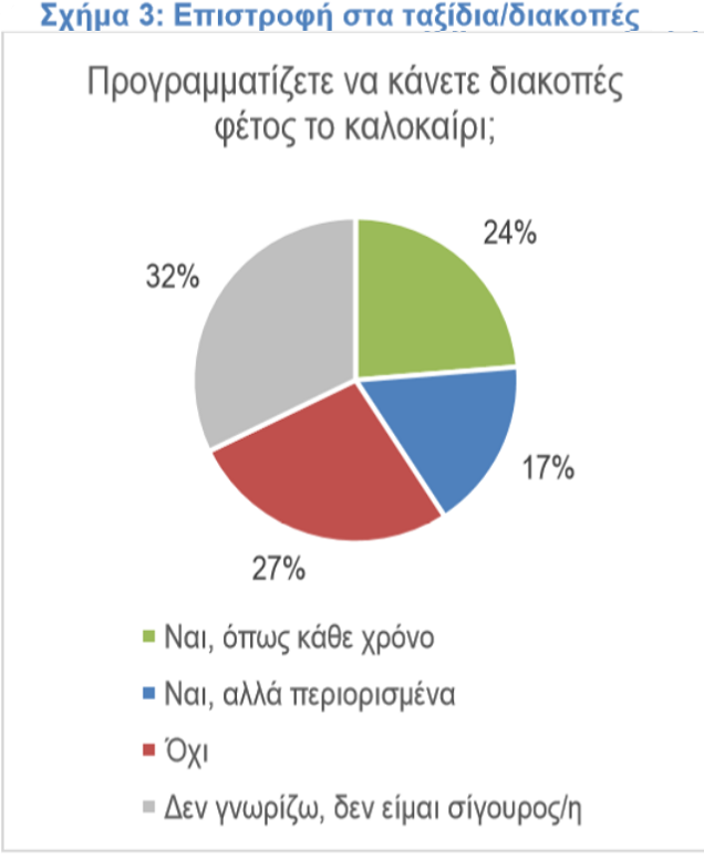 Ενδιαφέροντα ευρήματα καταγράφονται ακόμη σε σχέση με τις προβλέψεις των καταναλωτών για τις διακοπές. 1 στους 4 καταναλωτές (24%) δηλώνει ότι θα κάνει διακοπές όπως έκανε κάθε χρόνο. 17% ότι θα κάνει διακοπές, αλλά πιο περιορισμένα σε σχέση με τα προηγούμενα χρόνια. Το 27% δεν θα κάνει διακοπές φέτος, ενώ ένα αρκετά μεγάλο ποσοστό 32% (1 στους 3) δεν γνωρίζει ακόμα τι θα κάνει.