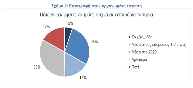 Ειδικότερα, σε ό,τι αφορά την αγορά της εστίασης που ξεκίνησε τη λειτουργία της σήμερα Δευτέρα 25 Μαΐου, το 33% ή 1 στους 3 θα ξεκινήσει άμεσα την συνήθεια του φαγητούς σε εστιατόριο-ταβέρνα, ενώ 17% αργότερα μέσα στο στον χρόνο. 1 στους 2 όμως δεν θα επιστρέψει στην οργανωμένη εστίαση μέσα στο 2020.
