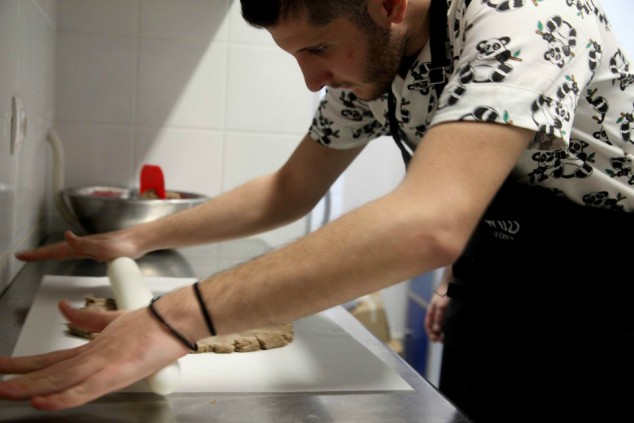 Στην κουζίνα, ανοίγοντας ζύμη από αμύγδαλα και λιναρόσπορο