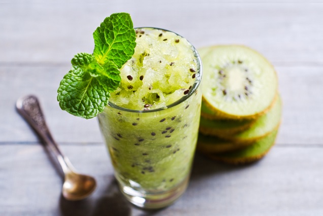 Εκτέλεση: Βράζετε σε σιγανή φωτιά το νερό, τη ζάχαρη και τα φύλλα μέντας μέχρι να διαλυθεί η ζάχαρη, αποσύρετε από τη φωτιά, φιλτράρετε το σιρόπι (πετάτε τα φύλλα μέντας) και αφήνετε να κρυώσει. Καθαρίζετε τα ακτινίδια, τα κόβετε σε κομμάτια και τα πολτοποιείτε στο μπλέντερ μαζί με το σιρόπι και το χυμό γκρέιπ φρουτ. Παγώνετε το μείγμα στην κατάψυξη μέχρι να πήξει και σερβίρετε σε ποτήρια.