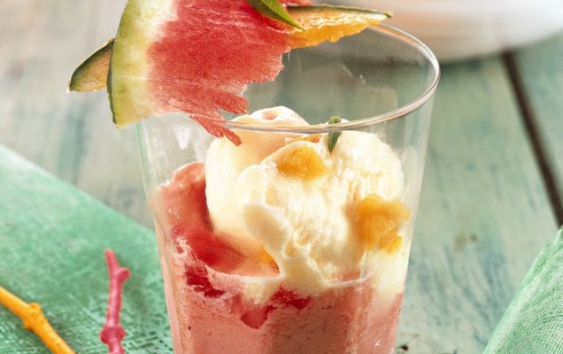Υλικά: 600 γρ. καρπούζι (χωρίς τα κουκούτσια και τις φλούδες, καθαρό βάρος, 100 ml νερό, 100 γρ. ζάχαρη, 4 μπάλες παγωτό γιαούρτι ή βανίλια