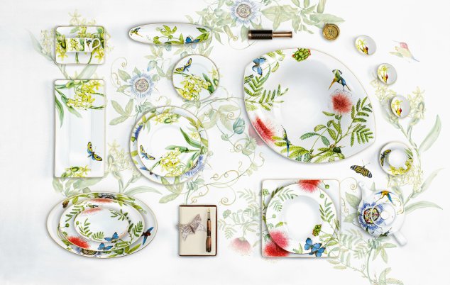Γεύμα στη γη της Αμαζονίας. Γαλαζοπράσινα κολιμπρί, τροπικές πεταλούδες, φρούτα του πάθους και ορχιδέες ζωντανεύουν στην περίτεχνη διακόσμηση του Amazonia, του σερβίτσιου της Villeroy&Boch που εμπνέεται από το θρυλικό ταξίδι του Alexander von Humboldt. Ήταν κάπου μεταξύ 1799 και 1804, όταν ο Γερμανός φυσιοδίφης και εξερευνητής περιπλανήθηκε στη γη του Αμαζονίου εξερευνώντας και περιγράφοντας για πρώτη φορά με επιστημονικό τρόπο σε ένα πολύτομο έργο την ασύλληπτη ποικιλία ειδών βλάστησης, ζώων και πτηνών που αντίκρισε εκεί.