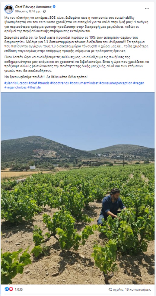 Μια ανάρτηση που μας καλεί να σκεφτούμε το χρέος μας απέναντι στον πλανήτη και τις επόμενες γενιές παραθέτοντας μάλιστα και σχετικά στοιχεία έκανε πρόσφατα ο Γιάννης Λουκάκος μέσα από τη σελίδα του στο Facebook. Στο πρόσφατο σχόλιό του ο αγαπημένος σεφ και ιδιοκτήτης του εστιατορίου «Ψωμί κι Αλάτι» υπενθυμίζει μεταξύ άλλων ότι η Ελλάδα είναι Τρίτη παγκοσμίως στη σπατάλη τροφίμων, το λεγόμενο food waste, και καλεί να αναλάβουμε τις ευθύνες μας.