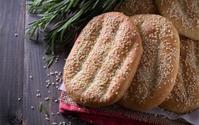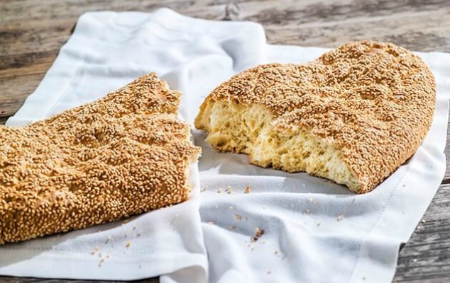 Υλικά: 500 γρ. αλεύρι σκληρό, 350 ml νερό σε θερμοκρασία δωματίου, 10 γρ. μαγιά ξερή, 1 πρέζα ζάχαρη κρυσταλλική, 10 γρ. αλάτι, 2 κουταλιές της σούπας ελαιόλαδο Για άλειμμα: 2 κουταλιές της σούπας νερό σε θερμοκρασία δωματίου, 1 κουταλάκι του γλυκού ζάχαρη, σουσάμι