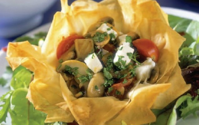 Υλικά: 8 (1 πακέτο 850 γρ.) χωριάτικα φύλλα, 400 γρ.ανθότυρο ή μανούρι κομμένο σε κύβους, 250 γρ. μανιτάρια σε φετάκια, 2 πιπεριές Φλωρίνης, 2 κρεμμύδια, 1 κλωναράκι θυμάρι, μερικά φύλλα βασιλικού, 3 κουταλιές της σούπας ξίδι βαλσαμικό, 1/2 φλιτζάνι του τσαγιού ελαιόλαδο, 2 σκελίδες σκόρδο λιωμένες, αλάτι, πιπέρι, 10 ντοματίνια κομμένα στη μέση, ρόκα για το γαρνίρισμα