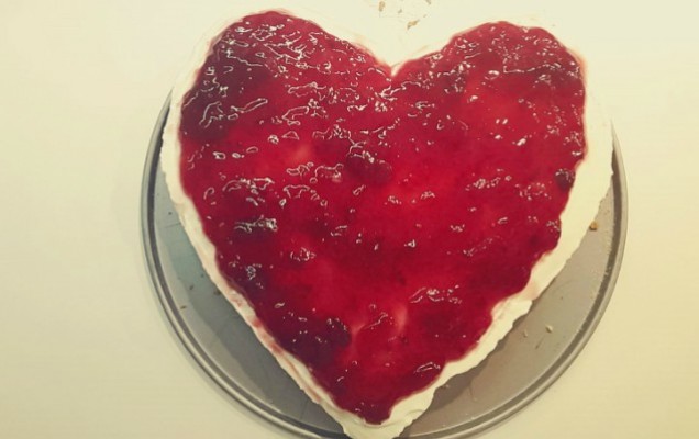 Εκτέλεση: Ετοιμάζετε τη βάση για το cheesecake ζεσταίνοντας το βούτυρο σε ένα κατσαρολάκι. Τρίβετε τα μπισκότα στο μίξερ και τα ανακατεύετε με το βούτυρο. Στρώνετε το μίγμα σε φόρμα σε σχήμα καρδιά. Βάζετε στο ψυγείο να παγώσει. Μουλιάζετε τα φύλλα ζελατίνας σε κρύο νερό. Σε ένα κατσαρολάκι βάζετε τους κρόκους και το ολόκληρο αυγό ελαφρά χτυπημένα, τη ζάχαρη, το αλάτι και το γάλα. Αφού το μίγμα ζεσταθεί, χωρίς να βράσει, ρίχνετε τα φύλλα ζελατίνας στραγγισμένα καλά και ανακατεύετε. Αφήνετε το μείγμα να γίνει χλιαρό. Χτυπάτε το ανθότυρο στο μίξερ να γίνει σαν κρέμα και ανακατεύετε μαζί με το μίγμα των αυγών. Χτυπάτε την κρέμα γάλακτος στο μίξερ με το σύρμα σε υψηλή ταχύτητα για να γίνει σφιχτή σαντιγί και την ανακατεύετε με το μίγμα τυριού. Αδειάζετε πάνω στη βάση μπισκότου και βάζετε στο ψυγείο να παγώσει. Απλώνετε στην επιφάνεια του γλυκού τη μαρμελάδα ή το σιρόπι έτσι ώστε να καλυφθεί ολόκληρο. Ξεφορμάρετε το γλυκό και κόβετε σε κομμάτια.