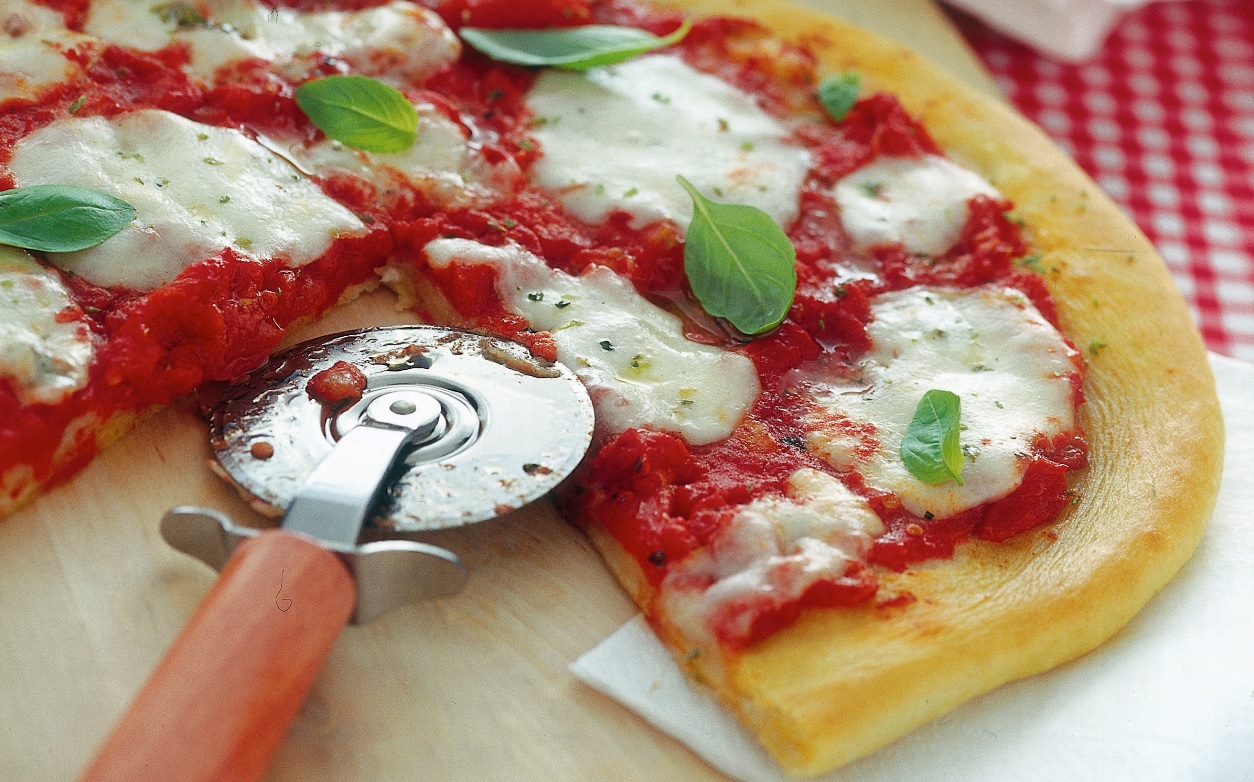 ΒΗΜΑ 3 Απλώνετε πάνω στη ζύμη τη σάλτσα ντομάτας. Κόβετε τη μοτσαρέλα σε φετάκια. Κατόπιν, προσθέτετε πάνω στη σάλτσα ντομάτας τα φετάκια της μοτσαρέλας και τις ελιές (προαιρετικά) κομμένες στη μέση. Αλατοπιπερώνετε και ψήνετε την πίτσα στους 200°C για 40’-45’ περίπου. Γαρνίρετε με φύλλα βασιλικού και σερβίρετε.
