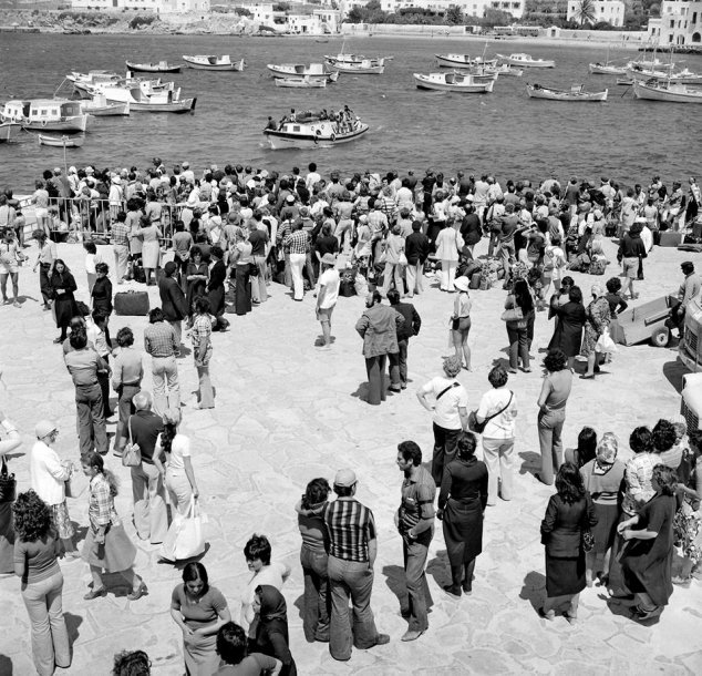Μύκονος | Φωτογραφία: Ζαχαρίας Στέλλας | Φωτογραφικό Αρχείο Μουσείου Μπενάκη | Σχόλιο follower @Ioanna Samiotaki: «Είναι το καλοκαίρι του 1978, γιατί ο νεαρός μπροστά με τα χέρια στις τσέπες είναι ο Δαμιανός Κουσαθανάς και φορά πένθος στο μανίκι του για τον θάνατο του αδελφού του Θανάση. Η γυναικεία σιλουέτα αριστερά με τα μαύρα μαλλιά είμαι εγώ και στο δεξί μου χέρι η Μαρία Κουσαθανά,η γυναίκα του Πετράν. Πίσω από μένα είναι η Ελένη Βαμβακούρη κ η Μαρία (η Λάταινα) Μάρα».