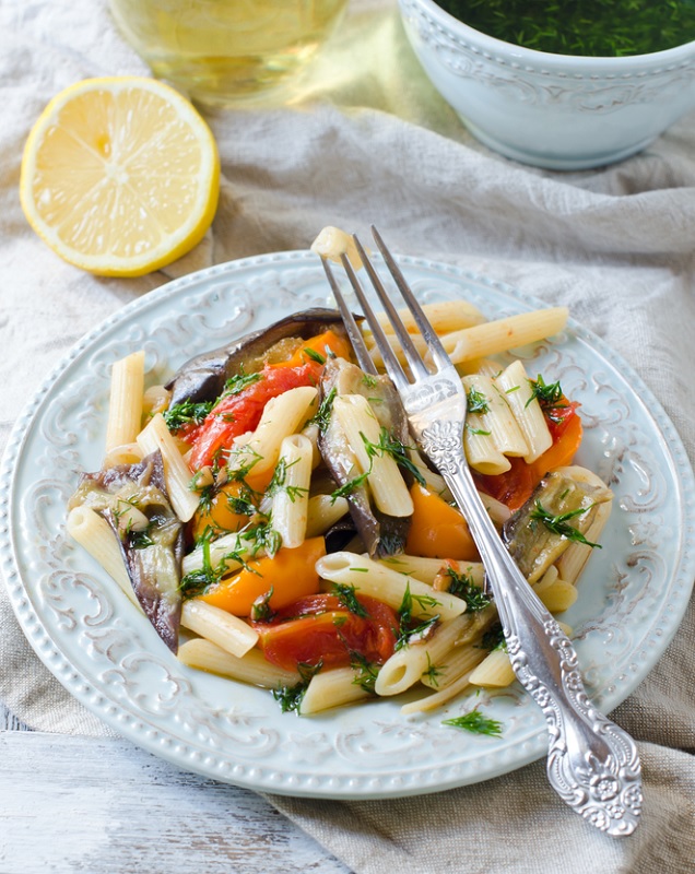 Υλικά: • 500 γρ. πένες ή άλλο κοντό ζυμαρικό • 3 μελιτζάνες • 3 πιπεριές γλυκές • 1/2 ματσάκι μαϊντανό ψιλοκομμένο • 1/2 ματσάκι άνηθο, δυόσμο ή βασιλικό ψιλοκομμένο • 2 κουταλιές της σούπας ξίδι από λευκό κρασί ή χυμός λεμονιού • 1/2 φλιτζάνι του τσαγιού ελαιόλαδο και 2-3 κουταλιές για το ψήσιμο των λαχανικών • 1/2 κουταλάκι του γλυκού ταμπάσκο (προεραιτικά) • 2 σκελίδες λιωμένες σκόρδο • αλάτι, πιπέρι