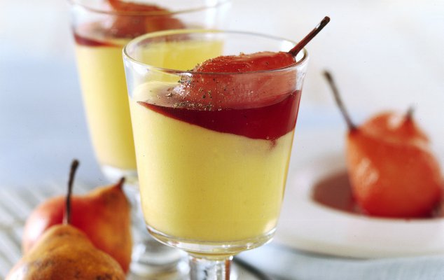 - Βάζετε τα αχλάδια όρθια μέσα στην κατσαρόλα και βράζετε για 15΄- 20΄ . Κατόπιν αφήνετε τα αχλάδια να κρυώσουν και τα βάζετε στο ψυγείο. Σερβίρετε σε 6 ποτήρια την κρέμα βανίλιας και όταν σφίξει ρίχνετε από πάνω τα αχλάδια και λίγο σιρόπι