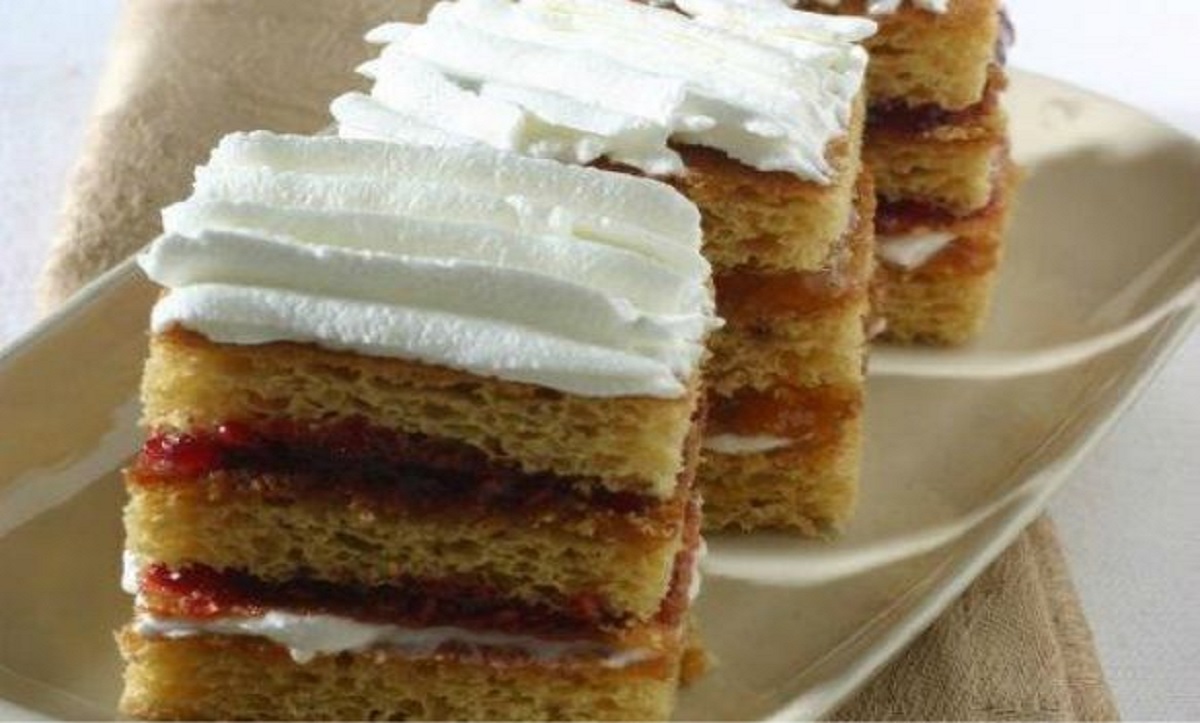 - Βάζετε σε τετράγωνη πιατέλα το πρώτο παντεσπάνι και απλώνετε μια καλή στρώση μαρμελάδα. Βάζετε το δεύτερο παντεσπάνι και πάλι μαρμελάδα. Καλύπτετε με το τελευταίο παντεσπάνι. Κόβετε την τετράγωνη τούρτα σε τετράγωνα παστάκια και τα γαρνίρετε με σαντιγί.