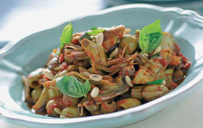 - Προσθέτετε τις αγκινάρες, κομμένες, μαζί με τις ελιές και συνεχίζετε το βράσιμο για 40’ ακόμη. Στο τέλος πασπαλίζετε το φαγητό με το μαϊντανό, προσθέτετε το κουκουνάρι και ανακατεύετε. Αφήνετε το φαγητό να βράσει για 2΄ και σερβίρετε.
