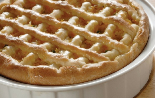 - Ντύνετε ένα στρογγυλό ταψάκι με το ένα από τα φύλλα ζύμης, ώστε να καλυφθεί ο πάτος και τα πλαϊνά του. Αδειάζετε μέσα τη γέμιση. Κόβετε όσο φύλλο περισσεύει έξω. Με ένα ροδελάκι με δοντάκια κόβετε το δεύτερο φύλλο σε λωρίδες πλάτους 1½ εκ. περίπου. Τις βάζετε πάνω στη γέμιση και τις πλέκετε σε σχήμα καφασωτό (χιαστί). Αλείφετε με βούτυρο τις λωρίδες και ψήνετε την πίτα στο φούρνο για 40’ - 45’ περίπου.
