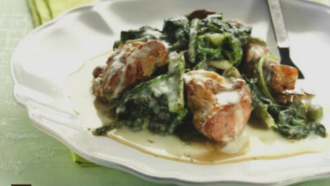 Συνταγή για αρνάκι φρικασέ με μαρούλι, σπανάκι και διάφορα άλλα χόρτα