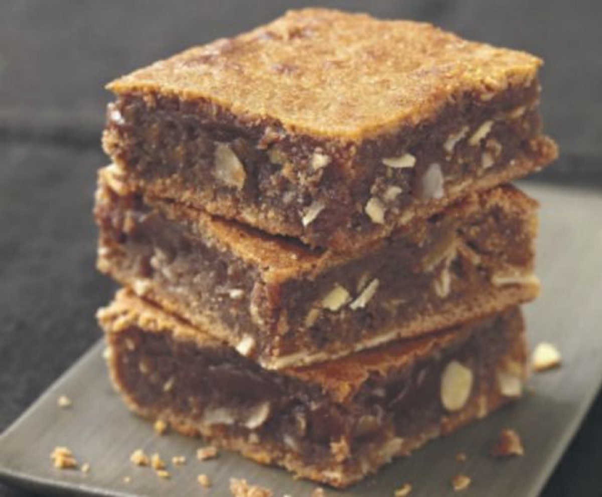 - Βουτυρώνετε και αλευρώνετε ένα παραλληλόγραμμο ή τετράγωνο σκεύος αδειάζετε το μείγμα και ψήνετε για 12'-13'.
