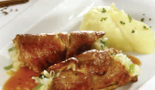 - Στη συνέχεια, πολτοποιείτε στο μπλέντερ τη σελινόριζα και τα μήλα. Προσθέτετε την κρέμα γάλακτος στον πουρέ. Αλατοπιπερώνετε, ανακατεύετε καλά και σερβίρετε τον πουρέ μαζί με τα χοιρινά ρολάκια και τη σάλτσα τους.