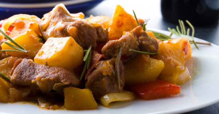 - Βάζουμε στην κατσαρόλα και το υπόλοιπο λάδι και σοτάρουμε αρχικά το κρεμμύδι και τις πιπεριές. Εν συνεχεία ρίχνουμε το σέλερι και τις πατάτες και ανακατεύουμε μια δυο φορές. Ξαναβάζουμε το κρέας στην κατσαρόλα και σβήνουμε με το κρασί. Μόλις πάει να απορροφηθεί τελείως, αλατοπιπερώνουμε το φαγητό, πασπαλίζουμε με λίγο δενδρολίβανο ή ρίγανη και ρίχνουμε 2 φλιτζάνια χλιαρό νερό. Αφήνουμε το φαγητό να μαγειρευτεί για 35'-40' ελέγχοντας κάθε τόσο μήπως χρειάζεται λίγο νερό ακόμη. Αποσύρουμε απ' τη φωτιά όταν το κρέας και τα λαχανικά έχουν μείνει μόνο με τη σάλτσα τους.