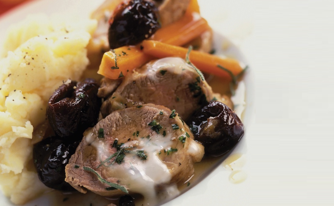 Συνταγή για χοιρινό κρέας (ψαρονέφρι ή πλάτη) με καρότα, ξηρά δαμάσκηνα, κρασί και χυμό εσπεριδοειδών. Ταιριάζει πολύ με πουρέ πατάτας.