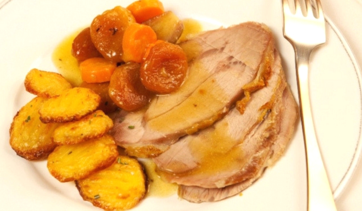 Χοιρινό μαγειρεμένο με κρασί και αποξηραμένα βερίκοκα, χειμωνιάτικο και ταιριαστό στο τραπέζι της Κυριακής ή της γιορτής.